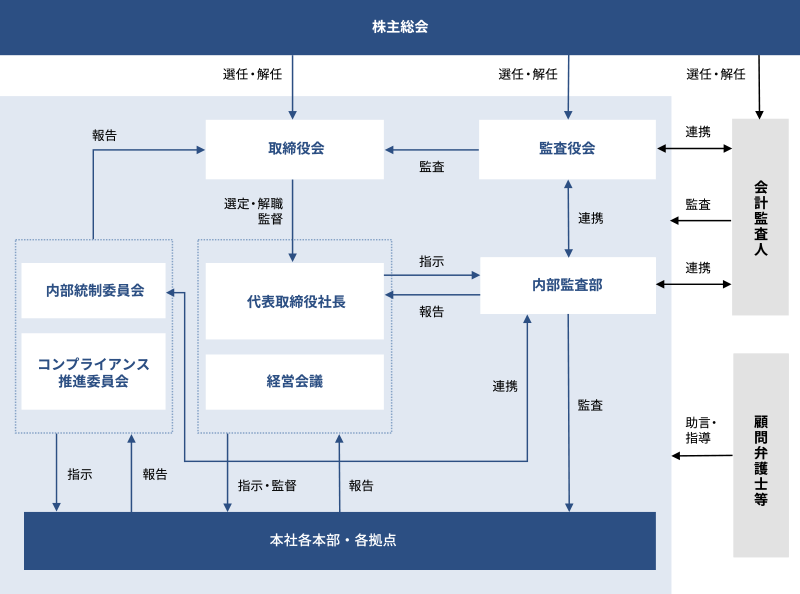 当社では、法令や企業倫理、社内ルール等の規範を遵守するための組織体制を構築し、内部統制に関する基本方針を示しています。